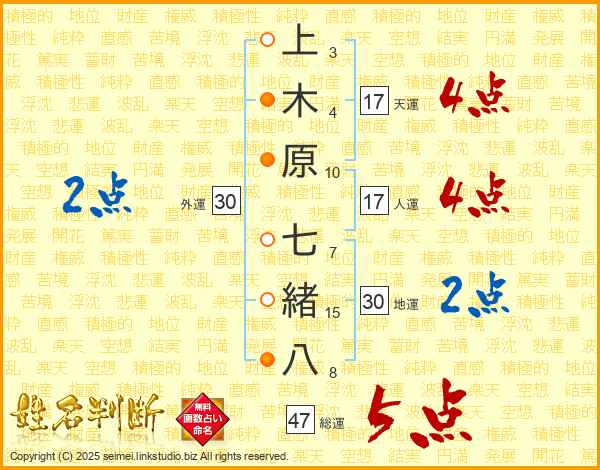 上(3画)木(4画)原(10画) 七(7画)緒(15画)八(8画)