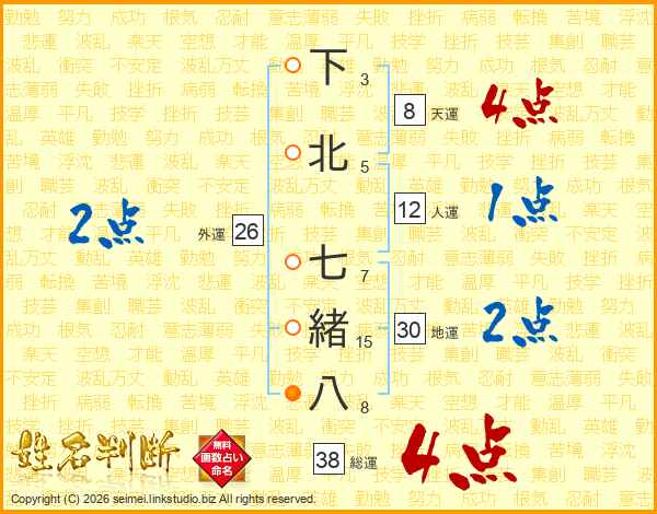 下(3画)北(5画) 七(7画)緒(15画)八(8画)