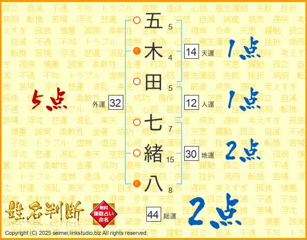 五(5画)木(4画)田(5画) 七(7画)緒(15画)八(8画)