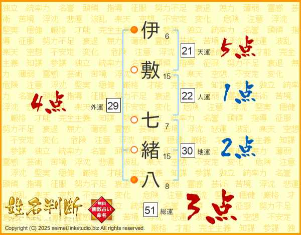 伊敷七緒八さんの総運は51画の3点!