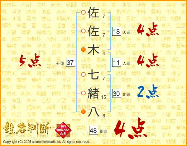 佐(7画)佐(7画)木(4画) 七(7画)緒(15画)八(8画)