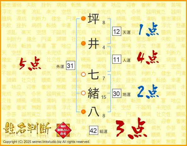 坪(8画)井(4画) 七(7画)緒(15画)八(8画)