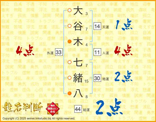 大(3画)谷(7画)木(4画) 七(7画)緒(15画)八(8画)
