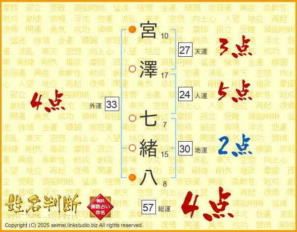 宮(10画)澤(17画) 七(7画)緒(15画)八(8画)