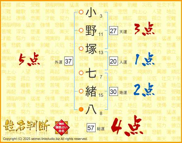 小(3画)野(11画)塚(13画) 七(7画)緒(15画)八(8画)