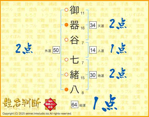 御器谷七緒八さんの人運は14画の1点!