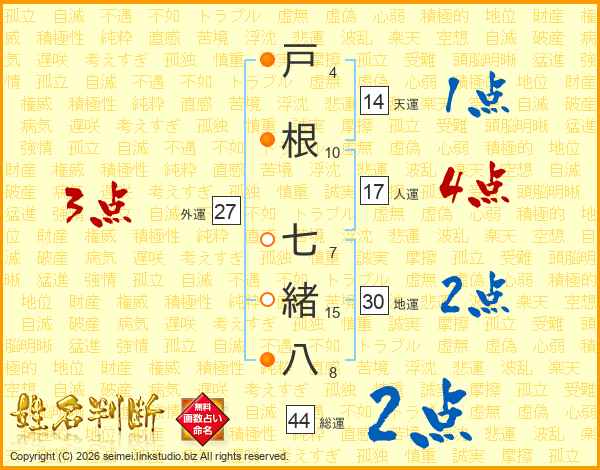 戸(4画)根(10画) 七(7画)緒(15画)八(8画)