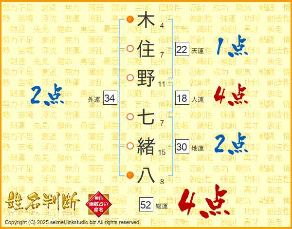 木(4画)住(7画)野(11画) 七(7画)緒(15画)八(8画)