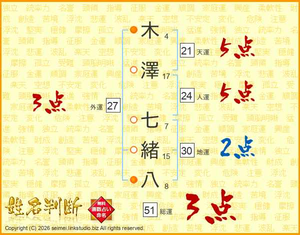 木(4画)澤(17画) 七(7画)緒(15画)八(8画)