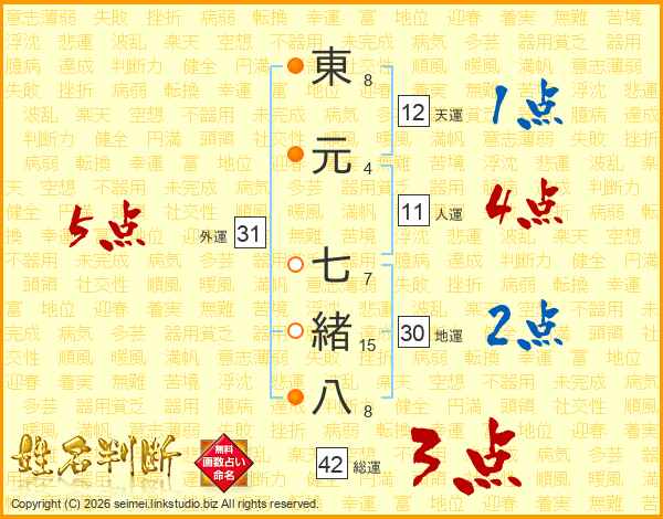 東(8画)元(4画) 七(7画)緒(15画)八(8画)