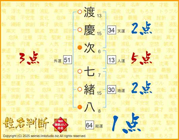 渡(13画)慶(15画)次(6画) 七(7画)緒(15画)八(8画)