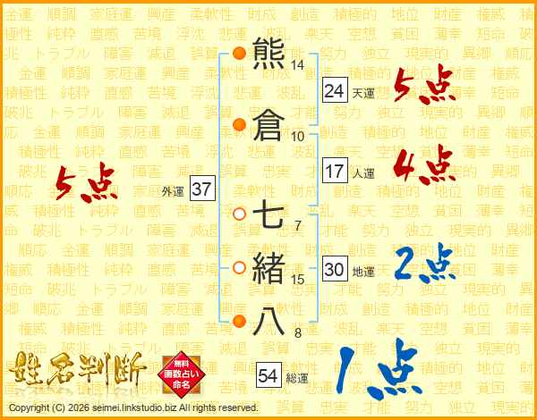 熊倉七緒八さんの外運は37画の5点!