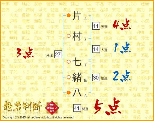 片村七緒八さんの総運は41画の5点!