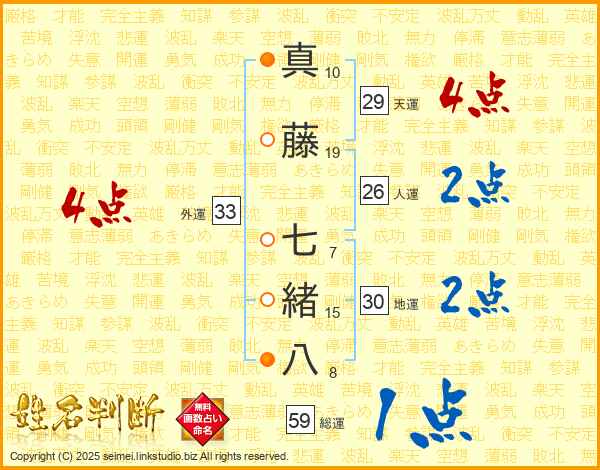 真藤七緒八さんの総運は59画の1点!