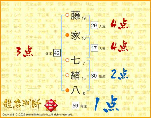藤(19画)家(10画) 七(7画)緒(15画)八(8画)