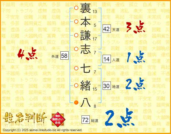 裏(13画)本(5画)謙(17画)志(7画) 七(7画)緒(15画)八(8画)