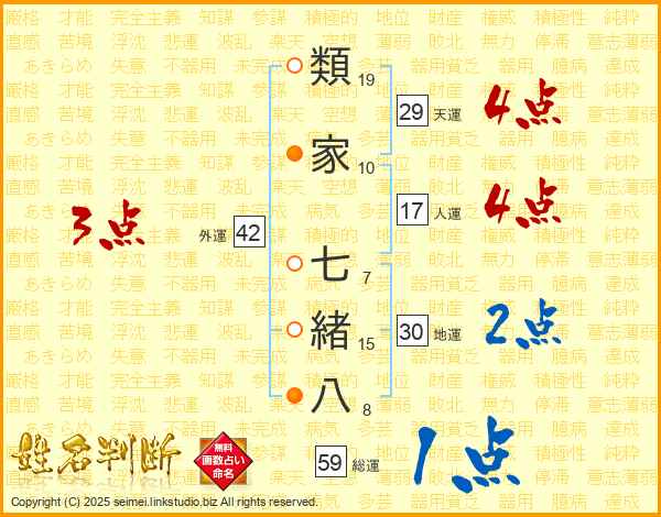 類(19画)家(10画) 七(7画)緒(15画)八(8画)