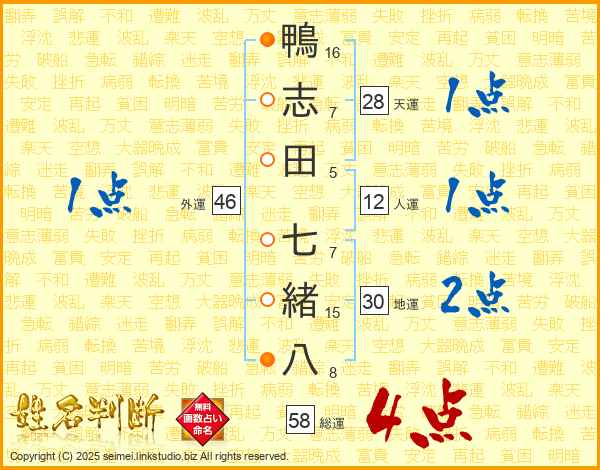 鴨(16画)志(7画)田(5画) 七(7画)緒(15画)八(8画)