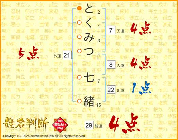 生活面を象徴する運勢です。外部から受ける影響力を表し、結婚運、家庭運や職場、環境への順応性を表します。総運から人運を引いた画数。姓や名が1文字の場合を除く。
