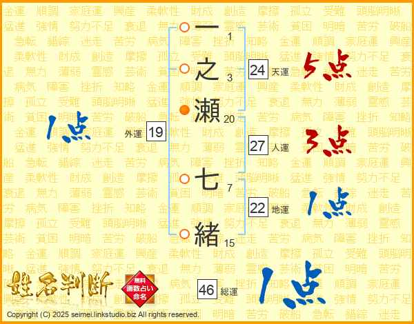一(1画)之(3画)瀬(20画) 七(7画)緒(15画)