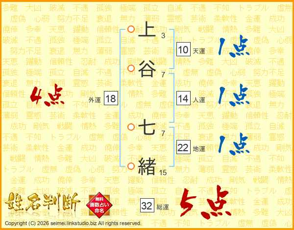 生活面を象徴する運勢です。外部から受ける影響力を表し、結婚運、家庭運や職場、環境への順応性を表します。総運から人運を引いた画数。姓や名が1文字の場合を除く。