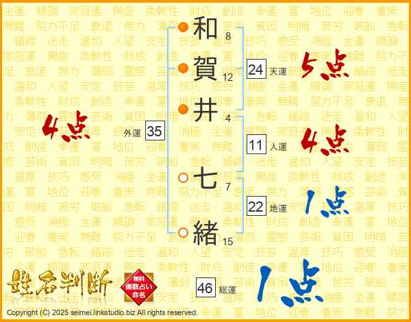 和(8画)賀(12画)井(4画) 七(7画)緒(15画)