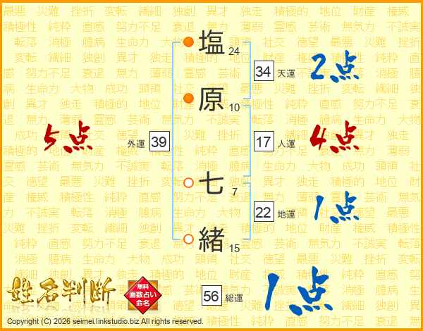生活面を象徴する運勢です。外部から受ける影響力を表し、結婚運、家庭運や職場、環境への順応性を表します。総運から人運を引いた画数。姓や名が1文字の場合を除く。