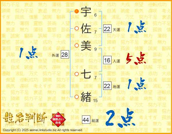 宇(6画)佐(7画)美(9画) 七(7画)緒(15画)