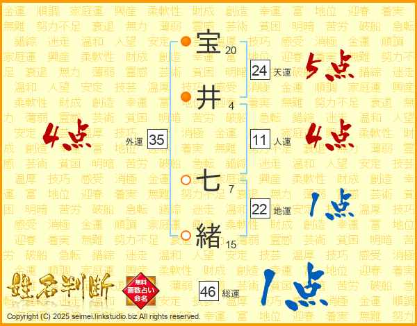 宝(20画)井(4画) 七(7画)緒(15画)