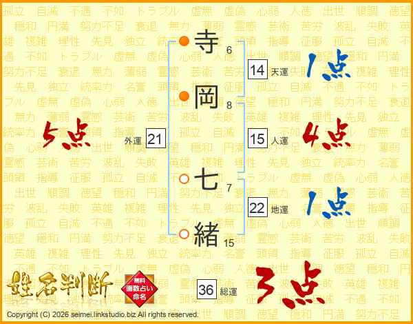 寺(6画)岡(8画) 七(7画)緒(15画)