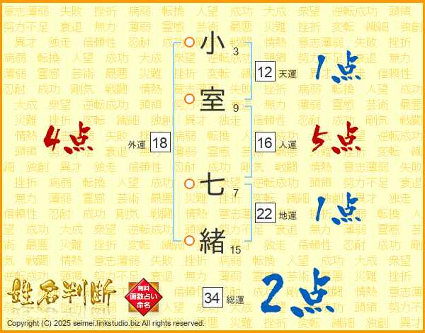 生活面を象徴する運勢です。外部から受ける影響力を表し、結婚運、家庭運や職場、環境への順応性を表します。総運から人運を引いた画数。姓や名が1文字の場合を除く。