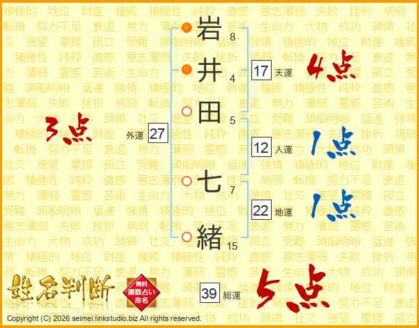 岩(8画)井(4画)田(5画) 七(7画)緒(15画)
