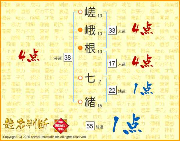 嵯(13画)峨(10画)根(10画) 七(7画)緒(15画)