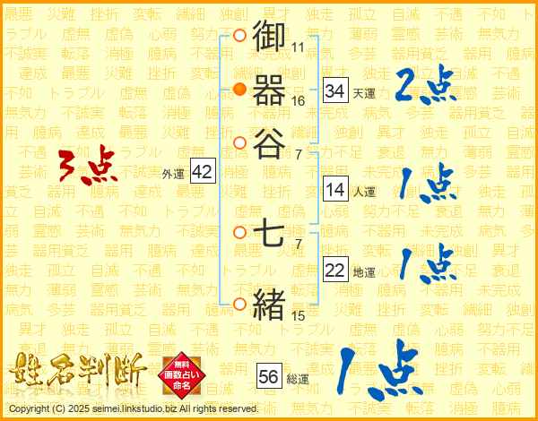 御(11画)器(16画)谷(7画) 七(7画)緒(15画)
