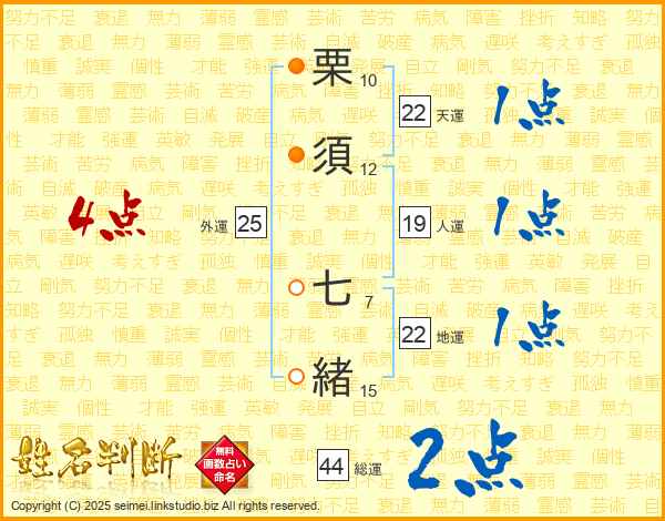 生活面を象徴する運勢です。外部から受ける影響力を表し、結婚運、家庭運や職場、環境への順応性を表します。総運から人運を引いた画数。姓や名が1文字の場合を除く。