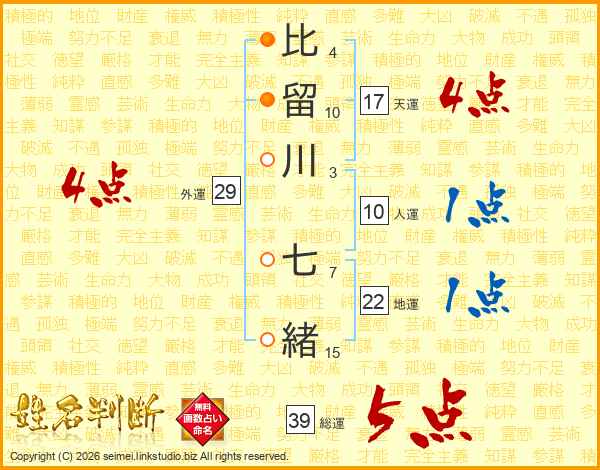 比(4画)留(10画)川(3画) 七(7画)緒(15画)