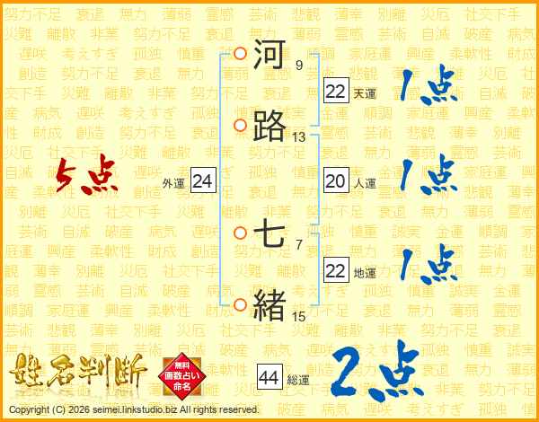生活面を象徴する運勢です。外部から受ける影響力を表し、結婚運、家庭運や職場、環境への順応性を表します。総運から人運を引いた画数。姓や名が1文字の場合を除く。