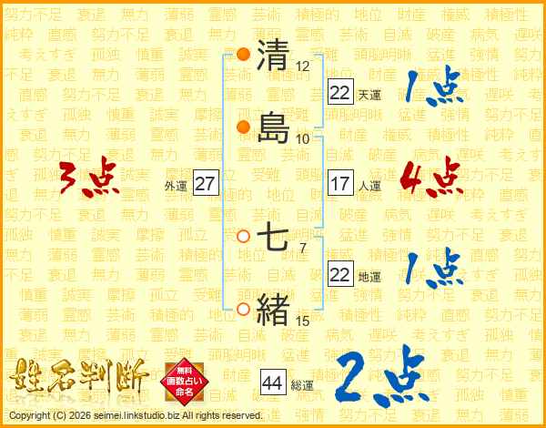 清島七緒さんの総運は44画の2点!