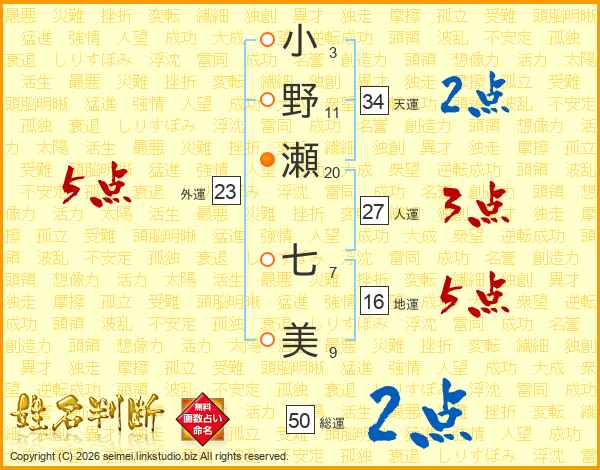 小(3画)野(11画)瀬(20画) 七(7画)美(9画)