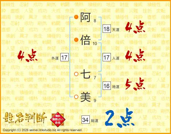 あなたの人生を表す1番重要な運勢です。生涯を通じて影響する総合運となり、主に50歳以降の晩年期に影響を及ぼします。苗字と名前の合計画数。