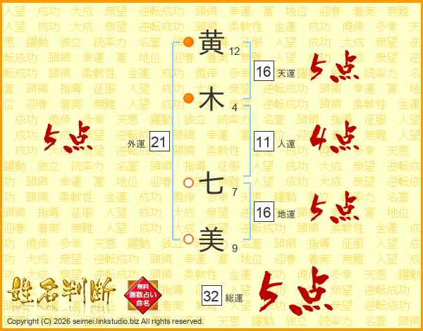 あなたの人生を表す1番重要な運勢です。生涯を通じて影響する総合運となり、主に50歳以降の晩年期に影響を及ぼします。苗字と名前の合計画数。