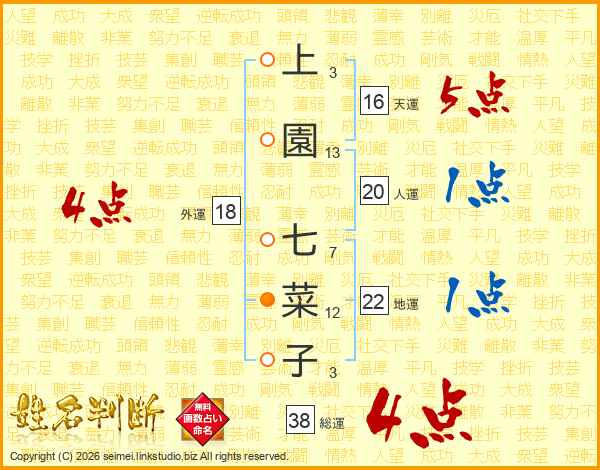 上園七菜子さんの総運は38画の4点!