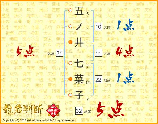 五(5画)ノ(1画)井(4画) 七(7画)菜(12画)子(3画)