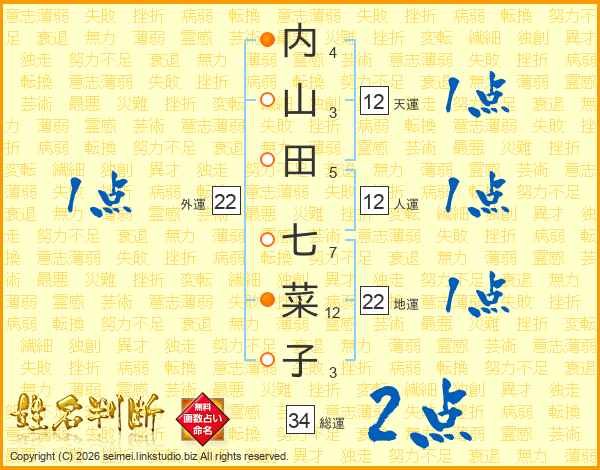 内(4画)山(3画)田(5画) 七(7画)菜(12画)子(3画)