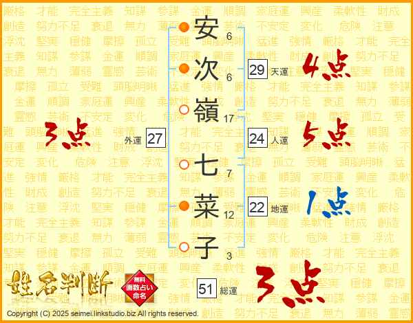 安(6画)次(6画)嶺(17画) 七(7画)菜(12画)子(3画)