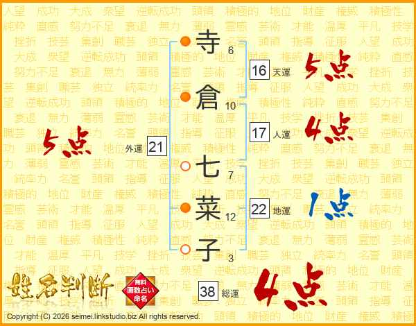寺(6画)倉(10画) 七(7画)菜(12画)子(3画)