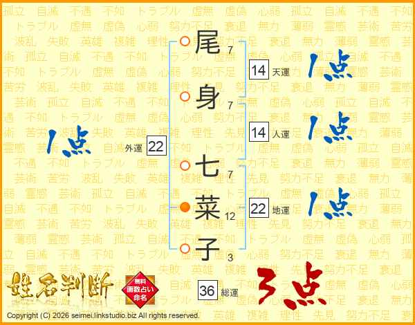尾(7画)身(7画) 七(7画)菜(12画)子(3画)