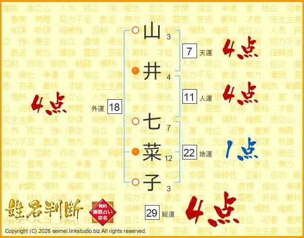 山(3画)井(4画) 七(7画)菜(12画)子(3画)