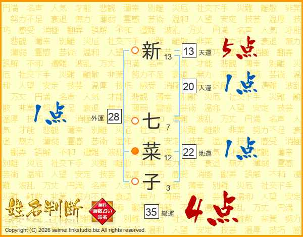生活面を象徴する運勢です。外部から受ける影響力を表し、結婚運、家庭運や職場、環境への順応性を表します。総運から人運を引いた画数。姓や名が1文字の場合を除く。
