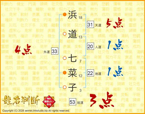 浜道七菜子さんの外運は33画の4点!